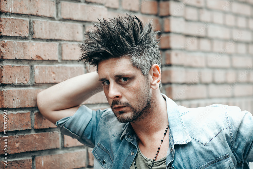 Portrait of handsome man in casual clothing posing on the street, looking away to a side. Color Toned Image. Concept urban man.
