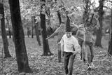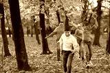 Happy family having holiday in autumn city park. Children and parents running, smiling, playing and having fun. Bright yellow trees and leaves