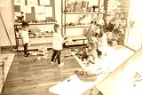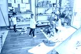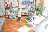 Beautiful teacher and group of toddlers playing around lots of toys at kindergarten