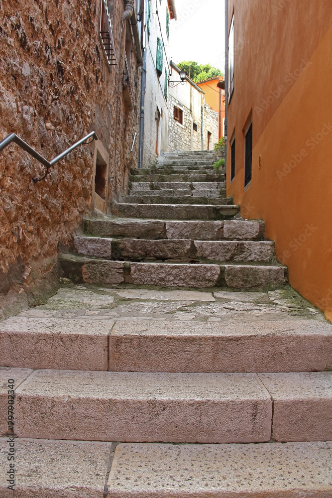 Romantic travel location, picturesque paved old narrow stone street in the Old Town of Rovinj, Croatia. Europe.