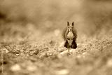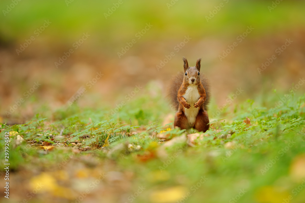 Surprised brown squirrel on the green ground