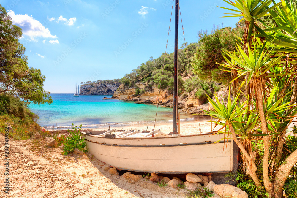 Cala Portals Vells Calvia Mallorca Majorca Spain old ship with palms and turquoise mediterranean sea