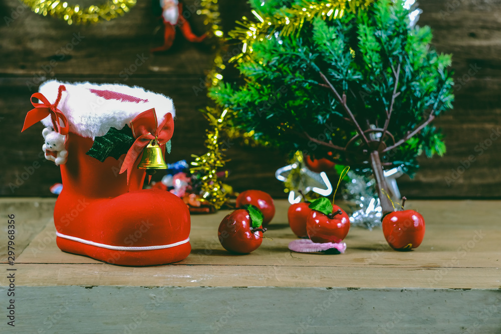 Red boot christmas or Santa's shoe on rustic wooden table,Christmas background.