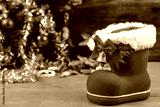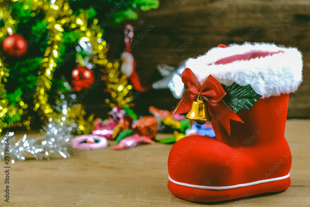 Red boot christmas or Santa's shoe on rustic wooden table,Christmas background.