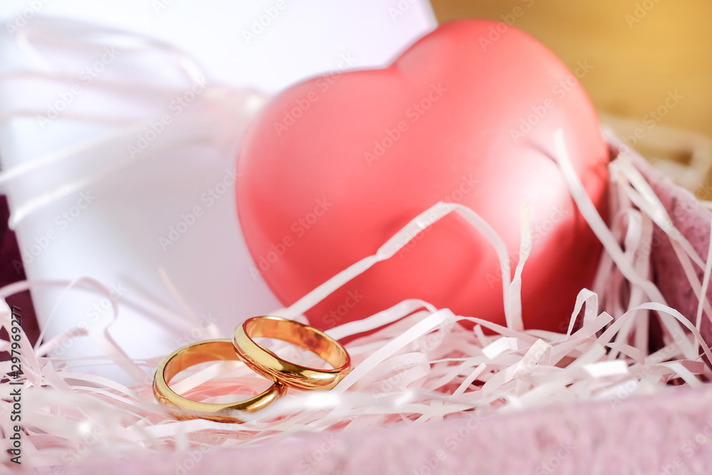 Red heart sign ball over invice letter with golden wedding ring on wood table.Wedding concept.