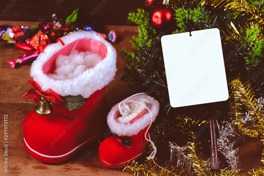 White bank card with christmas decoration on rustic wooden table,Christmas background.