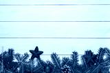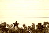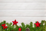 Christmas flat lay scene with decorations on bottom. Copy space on clean white wooden surface.