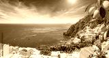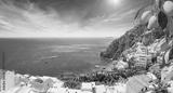 Panoramic aerial view of beautiful Positano with comfortable beaches and clear blue sea on Amalfi Coast in Campania, Italy.