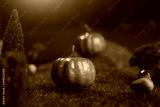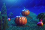 Halloween Pumpkins in a forest on a meadow in the light of the moon Halloween background. Fairy tale. Macro. Artificial magic dreamy world.