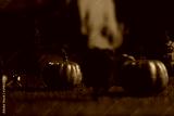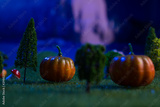 Pumpkins in a dark scary forest in the moonlight on Halloween night Halloween background. Fairy tale. Macro. Artificial magic dreamy world.