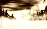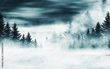 Dark winter forest background at night. Snow, fog, moonlight. Neon figure in the center