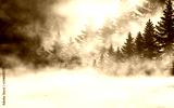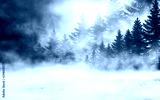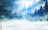 Dark winter forest background at night. Snow, fog, moonlight. Neon figure in the center