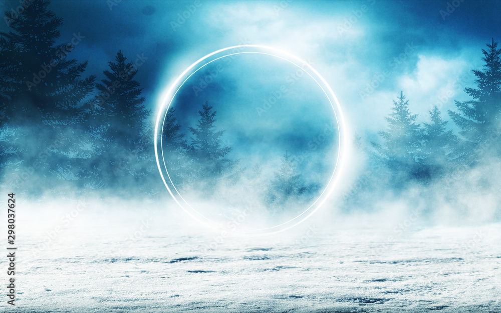 Dark winter forest background at night. Snow, fog, moonlight. Neon figure in the center