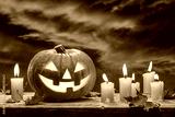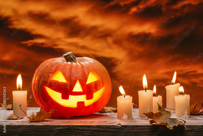 Halloween luminous jack-o-lantern pumpkin, autumn leaves and burning candles on wooden background. A crimson, ominous sky with clouds.