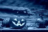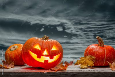 October luminous pumpkin, Jack-lantern, dry leaves against gray evening sky. Background of wood. Happy Halloween.