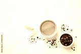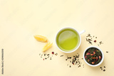Flat lay composition with green tea and lemon on beige background. Space for text