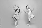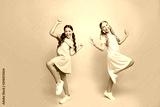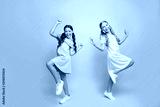 Full body profile photo of two people funny small school ladies models rejoicing summer holidays start wear bright blue yellow dresses isolated pink color background