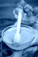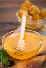 Fresh honey in the jars, with honeycomb and bee pollen