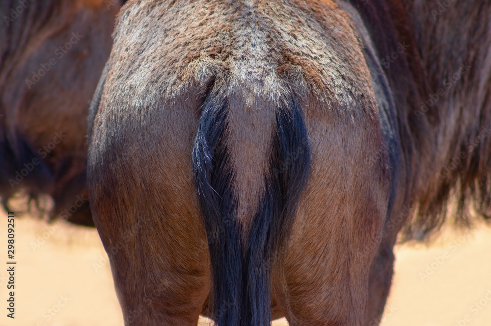 Wild african animals. Closeup of african Blue wildebeest rear with part of the tail.