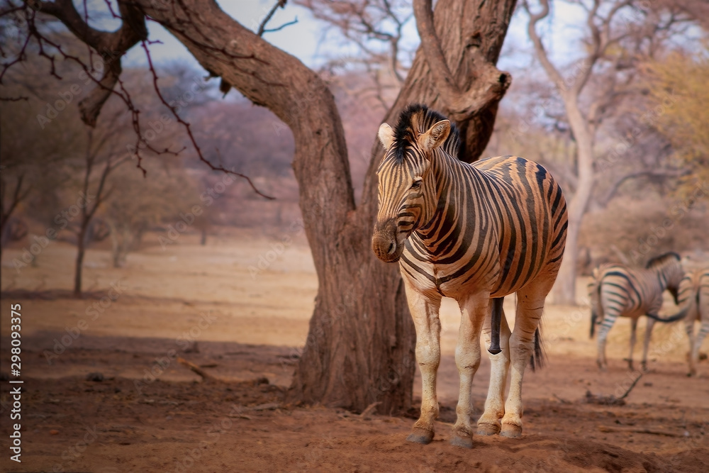 Wild african animals. Zebra close up portrait. African plains zebra on the dry yellow savannah grasslands.