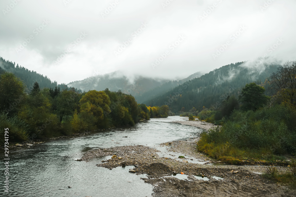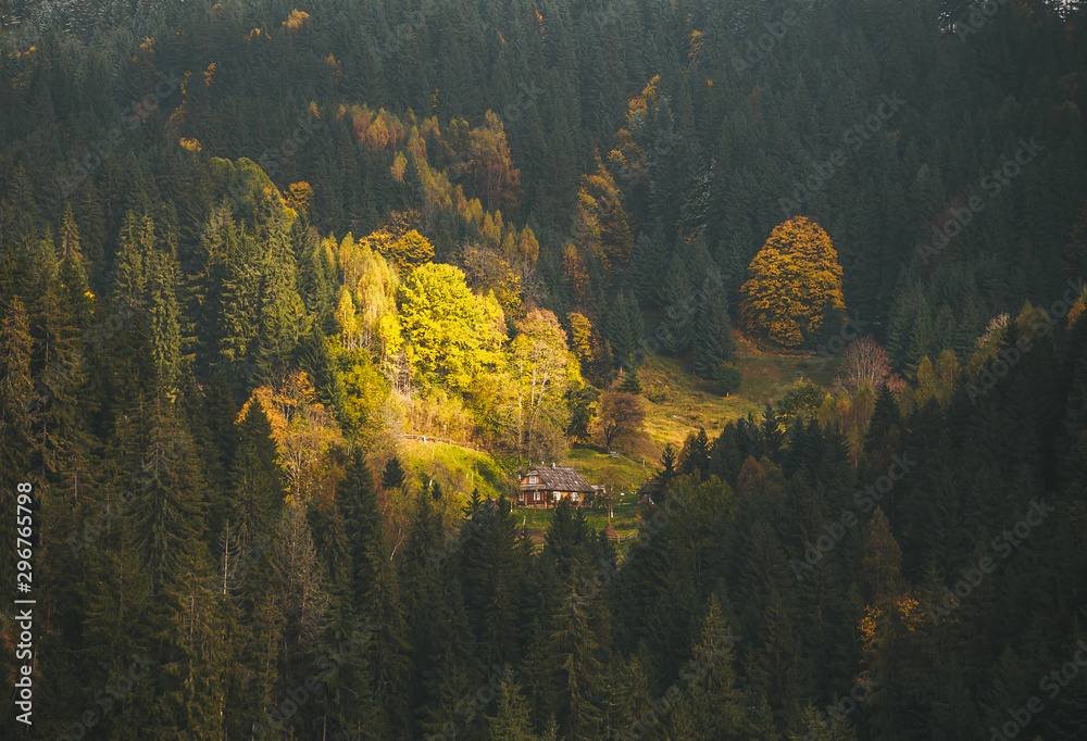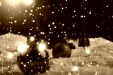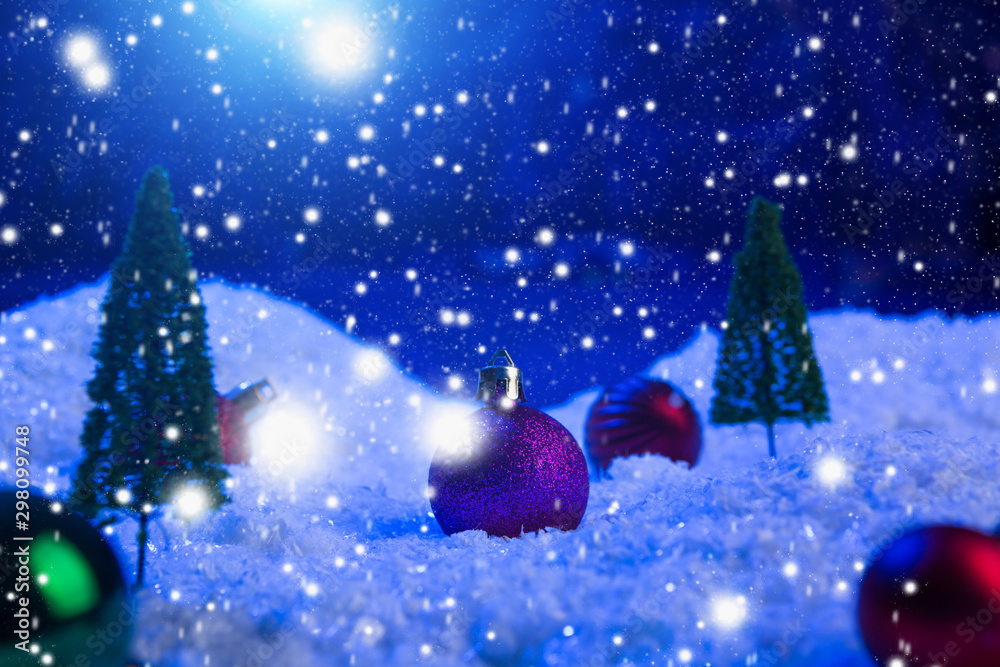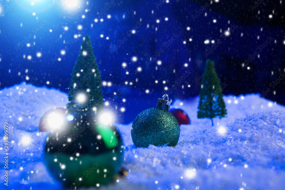 Christmas background with Christmas balls on snow over fir-tree, night sky and moon. Shallow depth of field. Christmas background. Fairy tale. Macro. Artificial magic dreamy world.