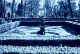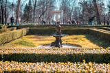 Source of the Retiro Park, surrounded by gardens in autumn. Unrecognizable couples walking. Madrid, Spain.