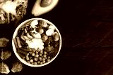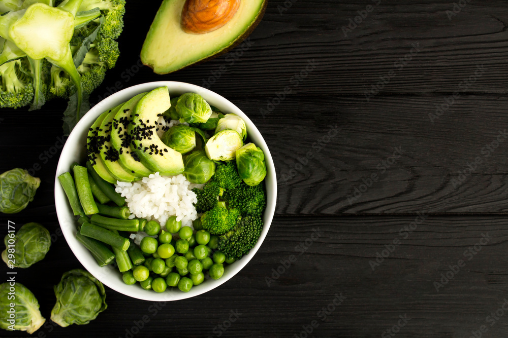 Vegan poke bowl with white rice and green vegetables in the white bowl on the black wooden background.Top view. Copy space.