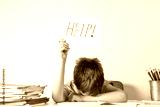 Sad tired frustrated boy sitting at the table with many books and holding paper with word Help. Learning difficulties, education concept.