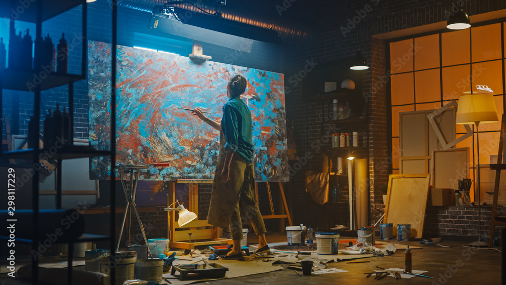 Talented Female Artist Works on Abstract Oil Painting, Using Paint Brush She Creates Modern Masterpiece. Dark and Messy Creative Studio where Large Canvas Stands on Easel Illuminated.
