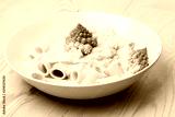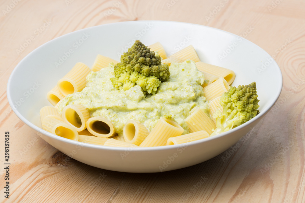 Pasta with Romanesco broccoli cabbage and mozzarella. On rustic background.