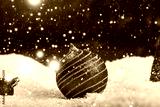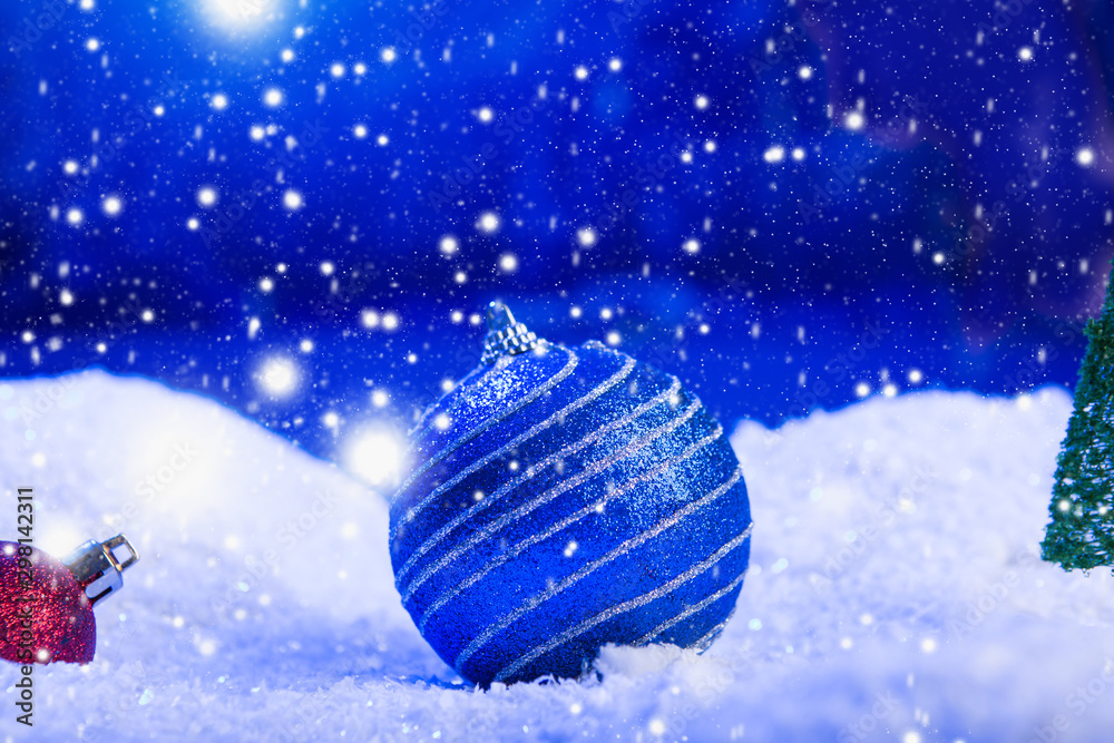 Christmas background with Christmas balls on snow over fir-tree, night sky and moon. Shallow depth of field. Christmas background. Fairy tale. Macro. Artificial magic dreamy world.