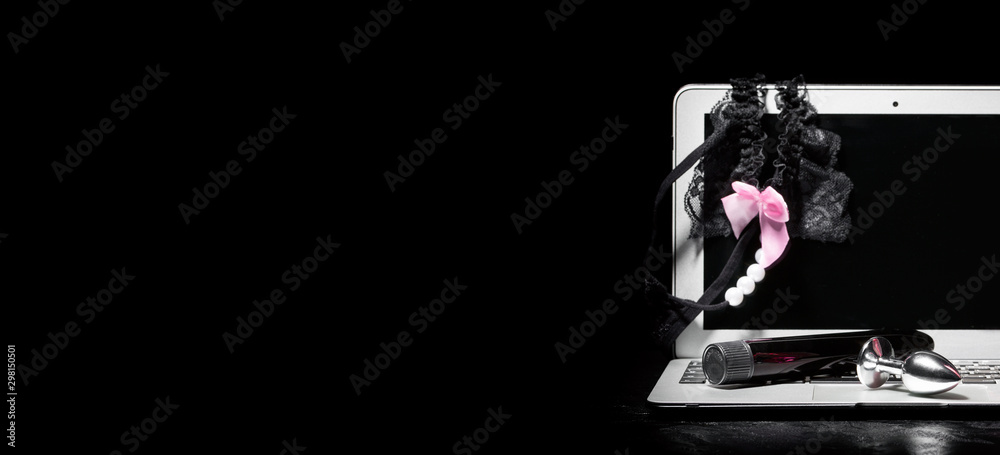 Adult webcam and virtual sex chat concept. Laptop with female panties, dildo vibrator and buttplug on black background with free space. Banner format