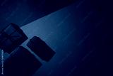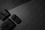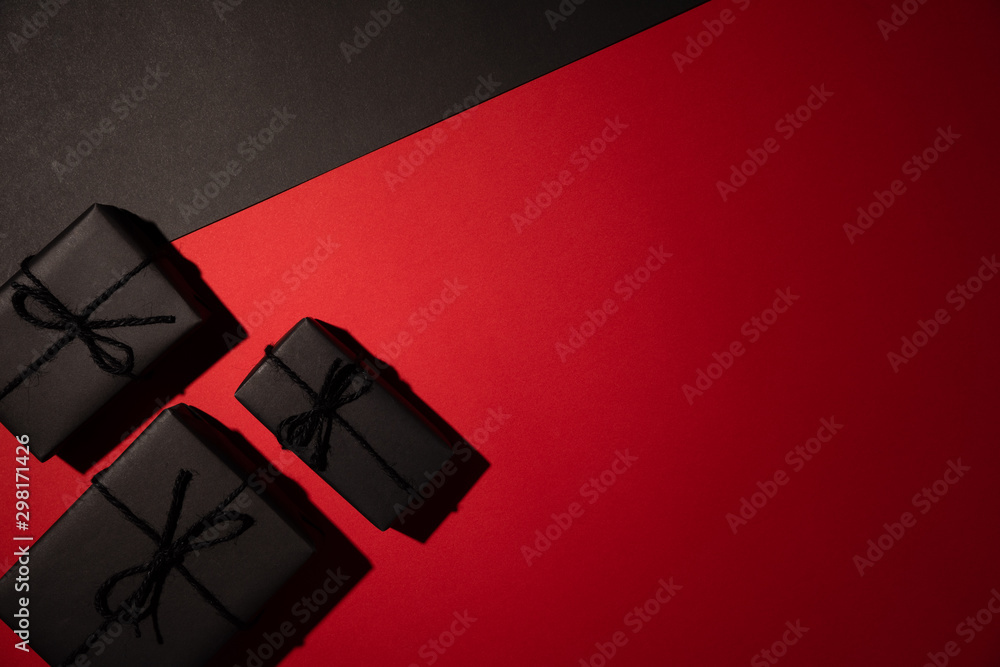 Top view of black gift box on black and red background with copy space for text. black Friday and Boxing Day composition.