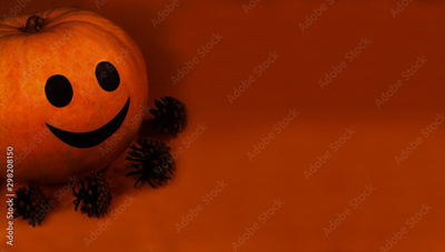 Halloween background. Copy space. Halloween pumpkin. Close-up. Smiling scary halloween pumpkin on a dark orange background.