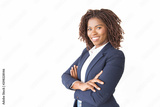 Happy successful female professional smiling at camera. Young African American business woman with arms crossed standing isolated over white background. Confident businesswoman concept
