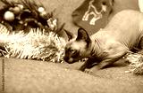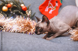 bald cat playing hunter on a grey sofa against a background of Golden Christmas tinsel and Christmas tree wreath with balls, canadian Sphinx