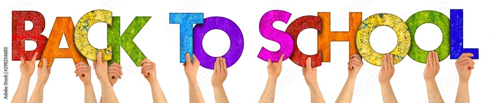 students people holding up colorful rainbow wooden letter with words back to school isolated white background. Education elementary study first day of school concept.