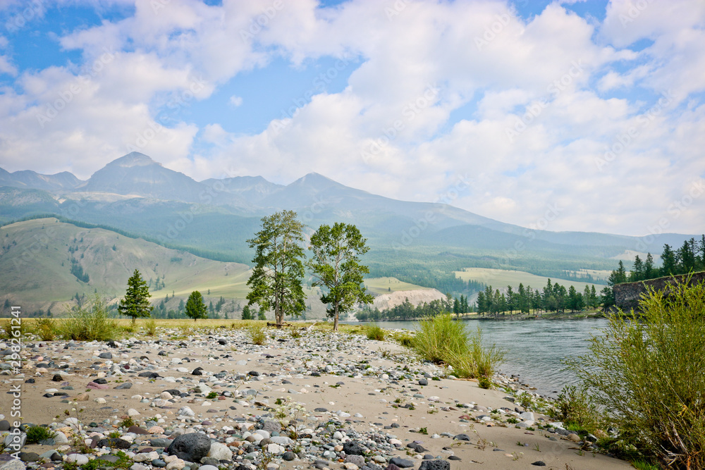 Two poplars on a pebble shore against the background of the river and blue mountains. Sayans, Siberia, Russia. Hiking and travel landscape.