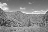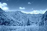 Mountain landscape - taiga and mountains in the summer against the sky.