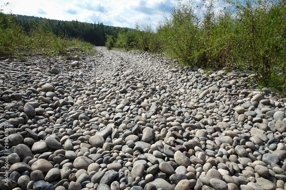 The road of river cobblestones. The texture of gravel.