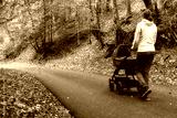 Woman with pram outside in forest