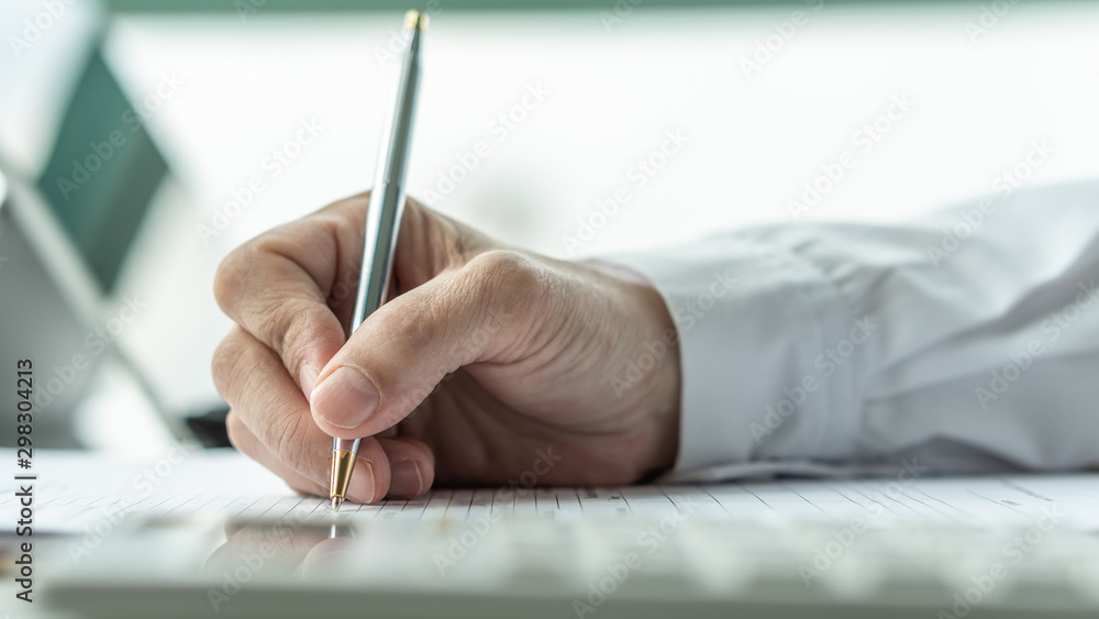 Paperwork document, claim form with business applicant or administrative person filling in company agreement or legal contract paper applying for job, or registering for health insurance