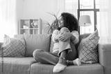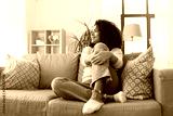 people, race, ethnicity and portrait concept - happy african american young woman sitting on sofa at home