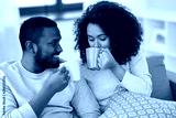 leisure and people concept - happy african american couple drinking coffee or tea at home
