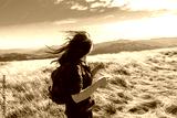 A young girl with flying in the wind hair enjoys a walk in the autumn mountains