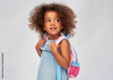childhood, school and education concept - happy little african american girl with backpack over grey background