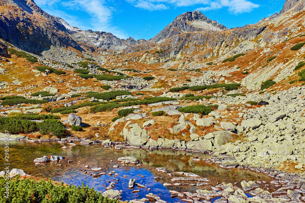 The High Tatras National Park and the autumn Pleso nad Skokom lake with rocks in the water in Slovakia