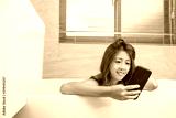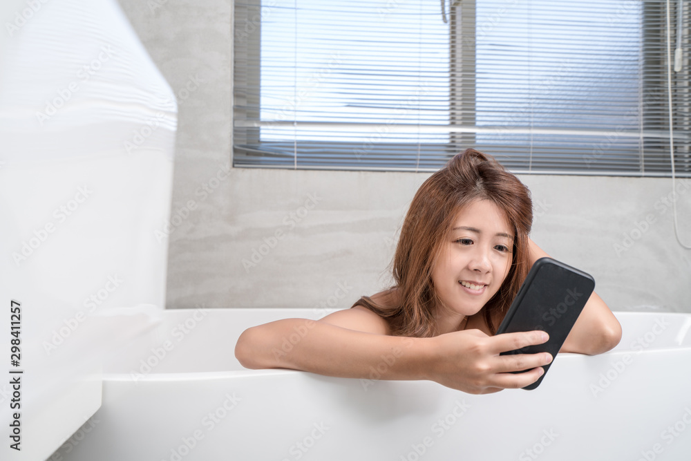 Young and beautiful girl using phone relaxing in the retro bath indoors