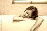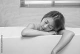 Young and beautiful girl using phone relaxing in the retro bath indoors