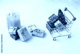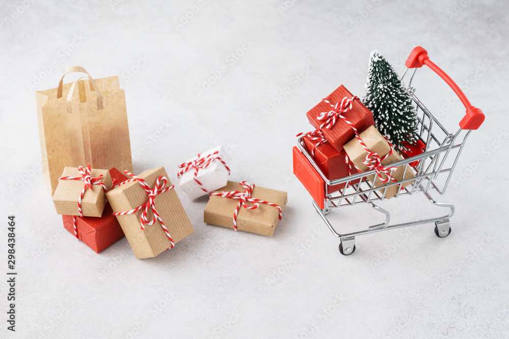 Shopping cart or trolley full of gift boxes and Christmas tree.